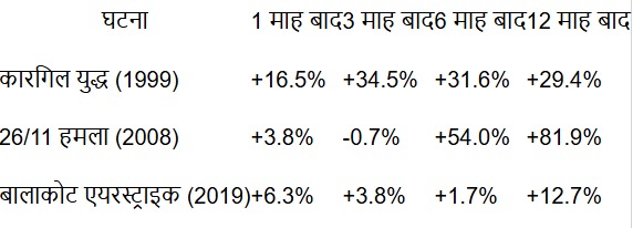 शेयर बाजारों पर तनाव का असर इतिहास बताता है कि युद्ध और आतंकी हमलों के समय शेयर बाजारों में तुरंत असर देखने को मिलता है। पुलवामा हमले के बाद पाकिस्तान का भारत को निर्यात 550 मिलियन डॉलर से घटकर मात्र 4.8 लाख डॉलर रह गया था। वर्तमान टकराव में पाकिस्तान के कराची स्टॉक एक्सचेंज में 6,500 अंकों की गिरावट दर्ज की गई, जबकि भारतीय बाजारों में मिला-जुला रुख रहा। हालांकि, डेटा दर्शाते हैं कि ऐसे तनावपूर्ण दौर में बाजारों में शुरूआती गिरावट होती है, लेकिन मिड से लॉन्ग टर्म में वे खुद को संभाल लेते हैं। उदाहरण के तौर पर, 26/11 हमले के बाद 12 महीने में Nifty ने 81.9% रिटर्न दिया था।